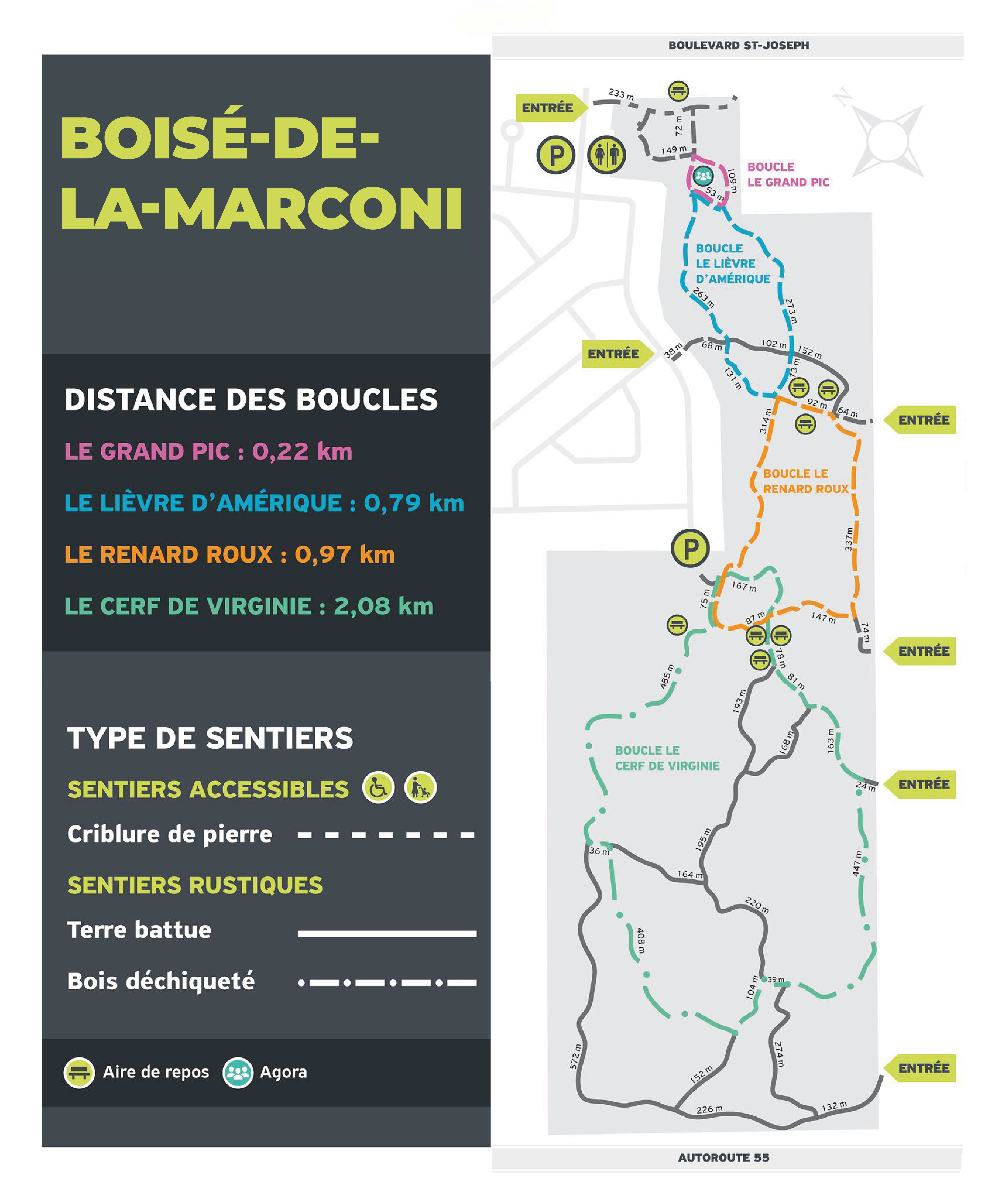 Une dizaine de sentiers sillonne ce territoire boisé de 60 hectares, mettant en valeur ses attraits forestiers, fauniques et écologiques. On y trouve un petit amphithéâtre de 30 places près du premier stationnement. Le Boisé a été baptisé en l'honneur de Guglielmo Marconi, inventeur de la transmission télégraphique sans fil, car c'est à cet endroit que la première antenne émettrice radiotéléphonique transatlantique au Canada a été installée en 1926.
