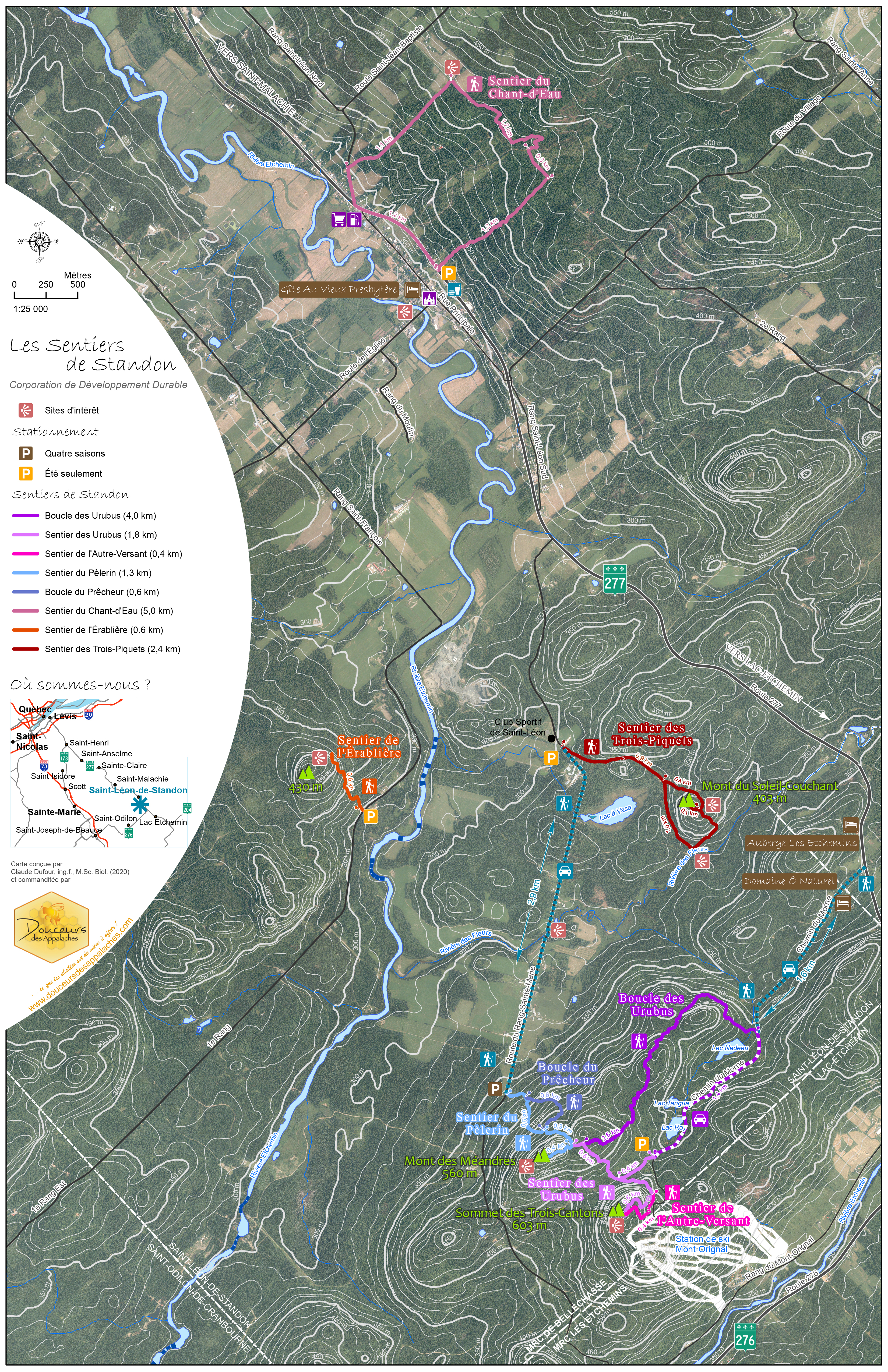 Ces sentiers, aménagés sur des terres privées, serpentent dans une forêt mixte et gravissent des pentes. Le sentier des Trois Cantons, offrant une vue d'ensemble sur le paysage environnant avec, au loin, le profil des montagnes du Maine. Le sentier des Trois Piquets conduit à la rivière des Fleurs. De son promontoire, il est possible de voir des oiseaux de proie. Le sentier de l'Érablière zigzague dans une érablière exposée au sud et conduit à un belvédère. Le sentier du Pèlerin mène en haut du mont des Méandres d'où on peut observer les courbes de la rivière Etchemin. On trouve aussi des panneaux d'interprétation de la flore et de la faune. On peut voir également des phénomènes géomorphologiques.