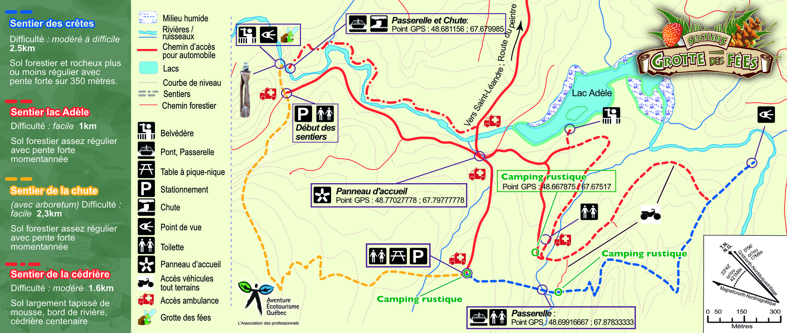 Au fil des siècles, la grotte a servi d'abri, de refuge et de cachette. Un canyon mène à la chute, d'une hauteur de 6,5 m, qui crée des vapeurs d'eau dans lesquelles, selon une légende, apparaît le visage d'une fée, d'où le nom du lieu. Le sentier des crêtes serpente dans une forêt mixte et mène à une falaise où un panorama s'ouvre sur le Saint-Laurent au nord et, au sud, sur les contreforts de la Matapédia. Le sentier de la chute longe un ruisseau dans une vallée où on peut voir des vestiges de l'époque des bûcherons du siècle dernier, et mène au lac Adèle par une passerelle de bois. Les sentiers sont jalonnés de panneaux d'interprétation de la faune et de la flore. Il est maintenant possible d'effectuer une boucle grâce au nouveau sentier du belvédère et celui des cèdres qui conduit à une passerelle suspendue près de la Grotte des fées. Point GPS 48.681156, -67.679985
