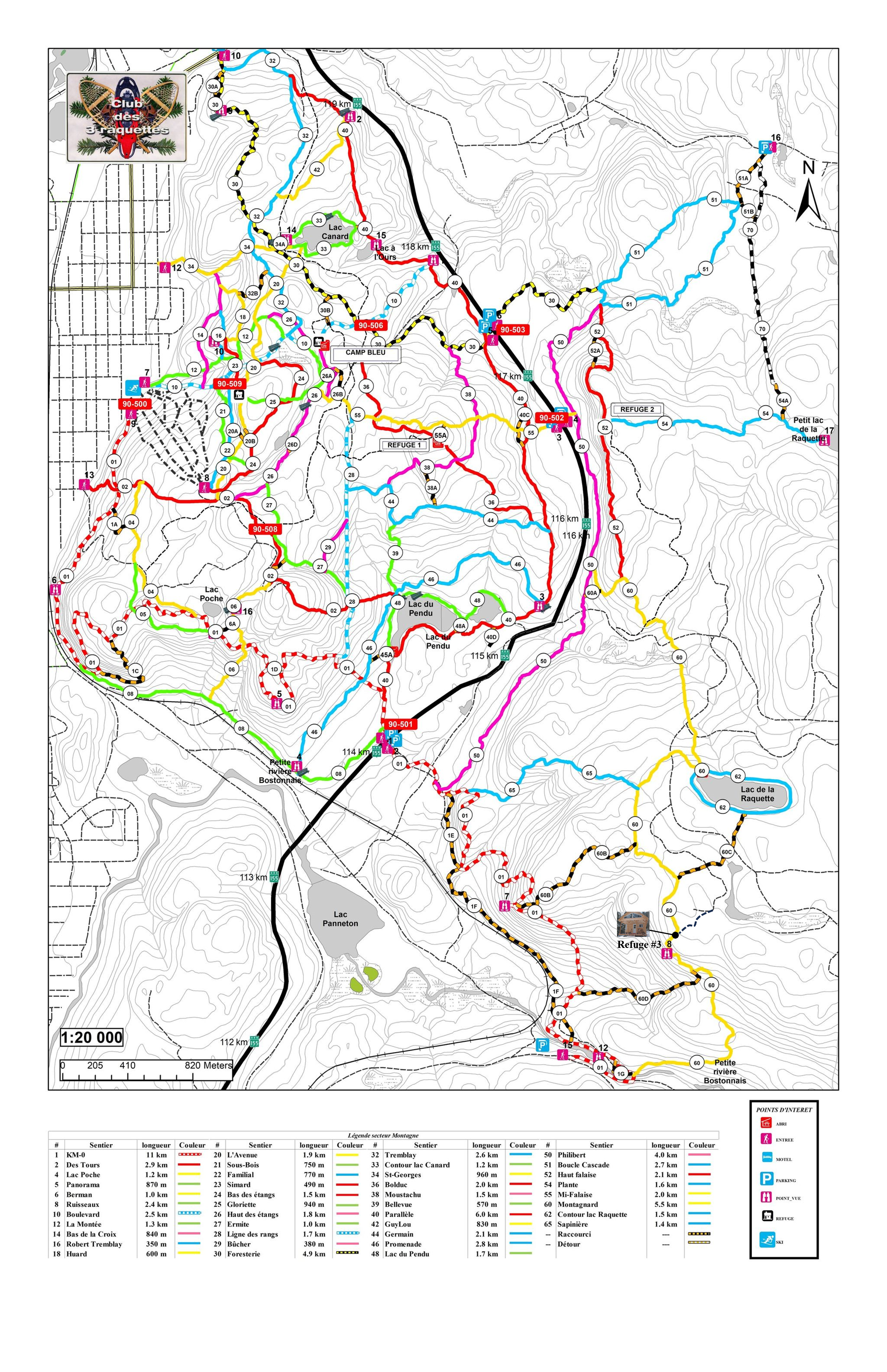 Les sentiers sillonnent un territoire montagneux jouxtant la ville de La Tuque, et sont ceinturés à l'est par la voie de contournement de la route 155. On aura plusieurs points de vue sur les lacs Canard, à l'Ours et du Pendu, ainsi que sur la ville. Les plus de 90 km de sentiers pédestre et de raquette sont entretenus par une formidable équipe de bénévole.