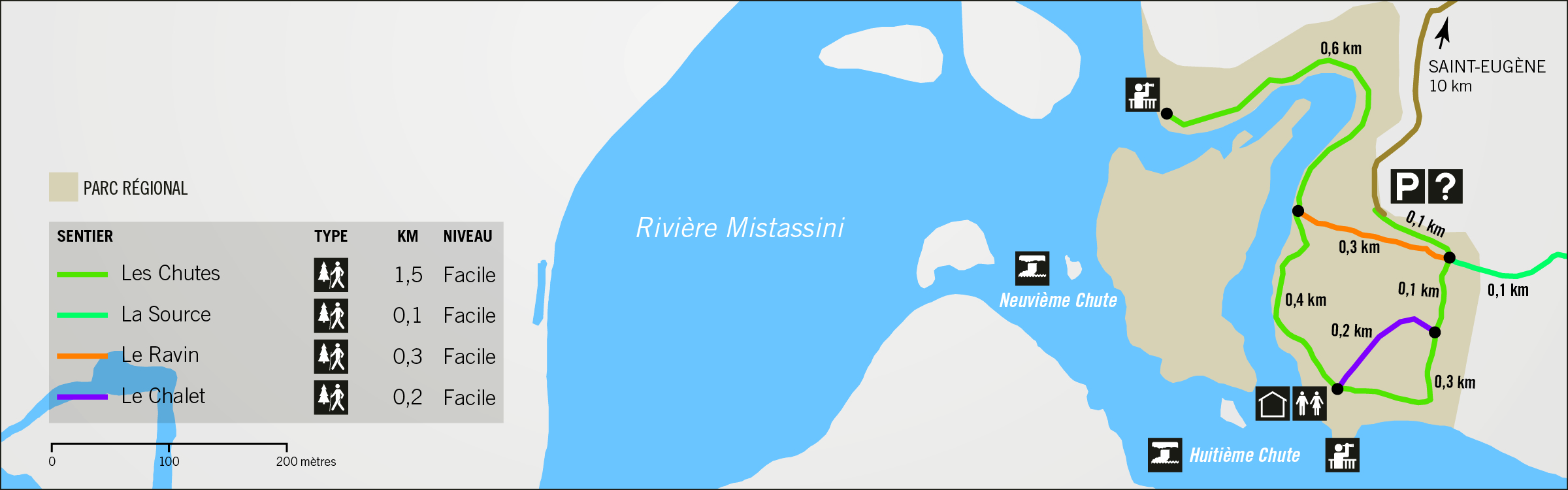 Le secteur Saint-Eugène est libre d'accès et il n'y a pas de personnel sur place. La Maison du Parc régional des Grandes-Rivières du lac Saint-Jean est le seul pôle d'accueil avec personnel et elle est située à Dolbeau-Mistassini.