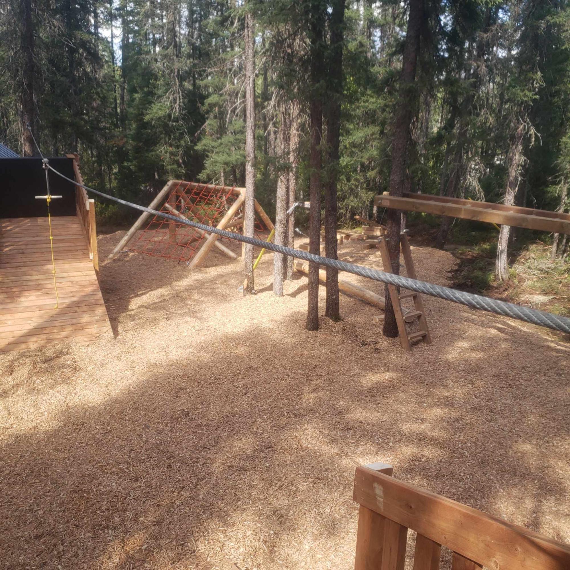 Modules d'hébertisme à l'entrée du sentier pour enfants âgés entre 5 et 12 ans. Panneaux d'interprétation. Aménagements fauniques pour l'omble de fontaine et la couleuvre en interprétation.