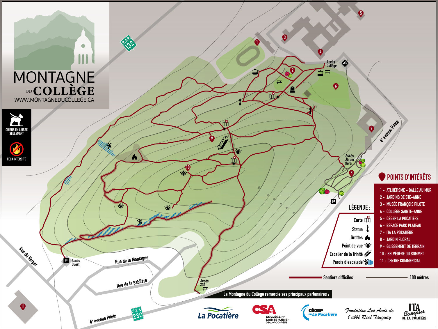 Située au cœur de la ville de La Pocatière, la montagne du Collège offre 5 km de sentiers pédestres dont certains ont été tracés il y a plus de cent ans. La montagne est composée de quartzite solide de dureté supérieure, ayant résisté à l'érosion glaciaire. Cette formation rocheuse, appelée monadnocks, est propice à la création de grottes. Les plus connues de la montagne du Collège sont la grotte des Fées et la Traversée des Thermopyles, accessibles par le sentier Le Sommet. Également accessible par ce sentier, un belvédère offre un panorama sur le fleuve Saint-Laurent. Plusieurs sentiers donnent accès à d'autres attraits de la montagne, un jardin floral, la Roche à Canon, Le Calvaire datant de 1904 et un cimetière d'une certaine importance historique. À l'été 2019, on a inauguré un sentier d'escalade. Le processus se poursuivra.