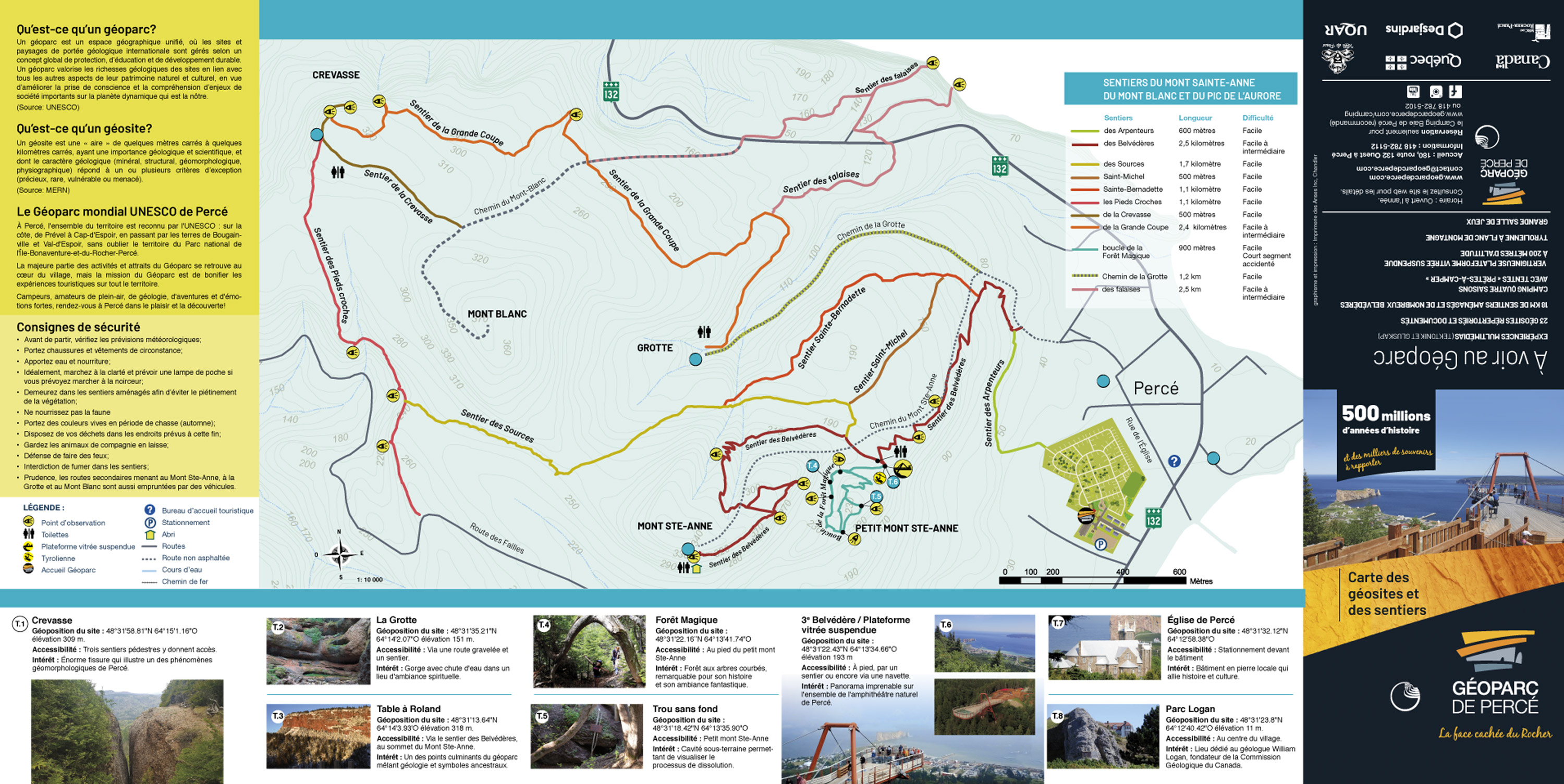 Les sentiers du Géoparc mondial UNESCO de Percé permettent de découvrir et d'observer plusieurs phénomènes géologiques exceptionnels et 23 géosites reconnus. Le plus spectaculaire est certainement le sommet du Mont Sainte-Anne, issu de la formation de Bonaventure et appelé "Table à Roland". La montagne en entier est composée de roches érodées, d'éboulis et de fissures, résultants de phénomènes climatiques comme le gel et le dégel. Le mont Blanc, voisin du mont Sainte-Anne, est un peu plus élevé. Sa végétation est divisée en plusieurs strates selon l'altitude. Ainsi, on passera d'une cédrière à la base à une forêt d'épinettes au sommet. Ce dernier est aussi recouvert de plantes rares dont des plantes arctiques-alpines et endémiques. En parcourant les sentiers sillonnant ces deux sommets, on aura plusieurs points de vue sur la région dont un donnant sur le rocher Percé. On atteindra aussi, sur le chemin du Mont-Blanc, La Grande Crevasse, d'une profondeur de 60 m et une gorge avec une chute d'eau (La Grotte). Certains randonneurs s'adonnent aussi au géoaching, très populaire dans les sentiers du territoire.