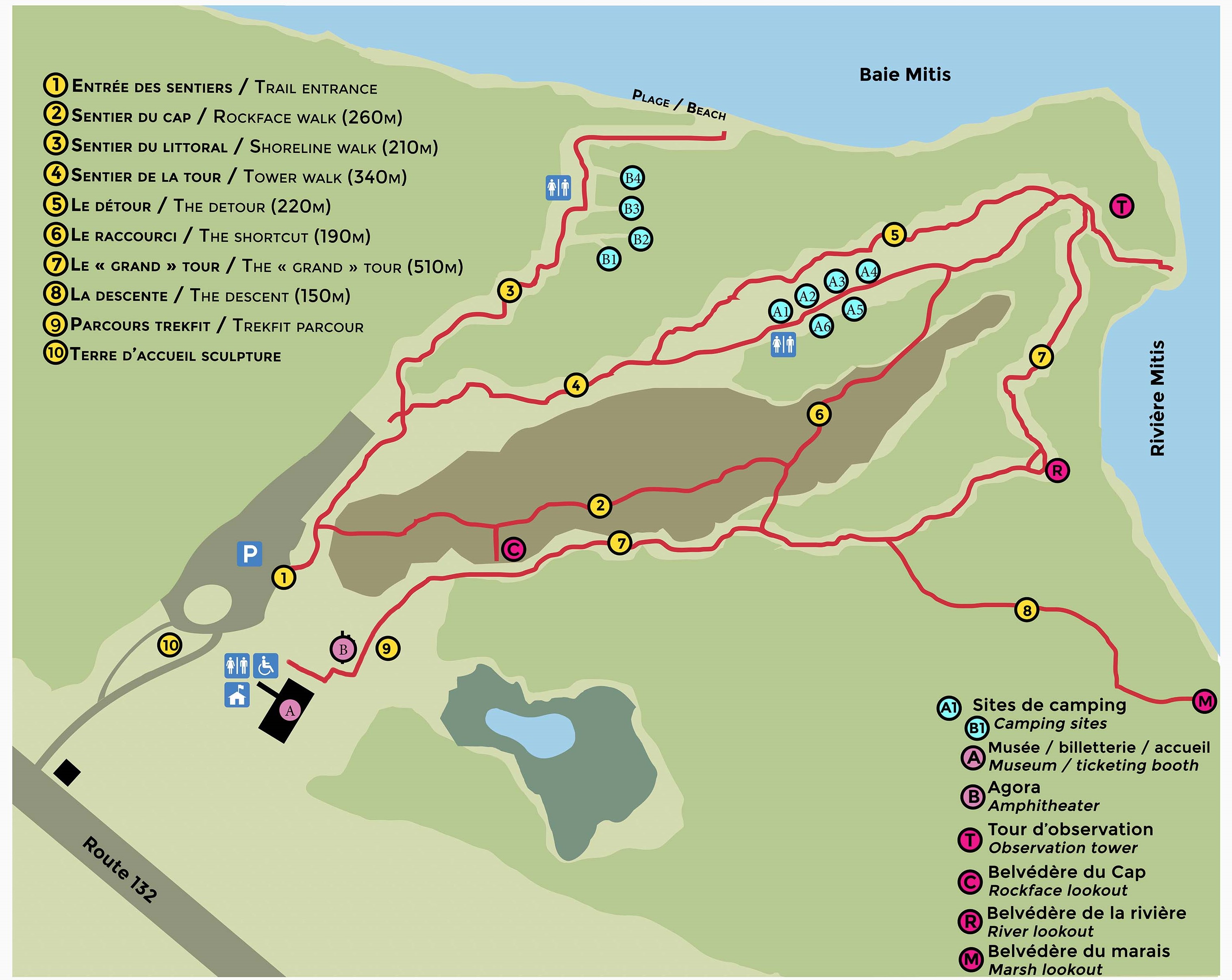 Le sentier, d'une durée approximative d'une heure, sillonne des écosystèmes riches et diversifiés, soit le marais, la forêt et le littoral, et inclut de l'architecture écologique impressionnante. Une tour d'observation de huit mètres offre une vue imprenable sur l'estuaire du Saint-Laurent et l'embouchure de la rivière Mitis.