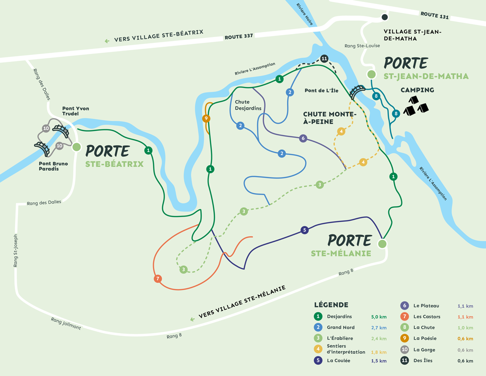 Ce parc, doublement récompensé cette année a été lauréat de la 4e édition du Gala Conserv'eau de la CARA et récipiendaire d'un Excelsior de la Chambre de Commerce du Grand Joliette. D'une superficie de 305 hectares, il chevauche trois municipalités : Saint-Jean-de-Matha, Sainte-Béatrix et Sainte-Mélanie. Les rivières Noire et L'Assomption y serpentent. Certains sentiers longent cette dernière, qu'on peut traverser grâce à trois passerelles dont la plus longue mesure 52 m. En parcourant les différents sentiers (plus de 21 km de sentiers), on sillonnera une forêt diversifiée contenant des arbres centenaires. Outre les chutes Monte-à-Peine, les Dalles et Desjardins, on verra des ruisseaux, des cascades et un canyon. On pourra aussi emprunter un sentier d'interprétation de la nature. On aura des points de vue variés grâce à six belvédères.