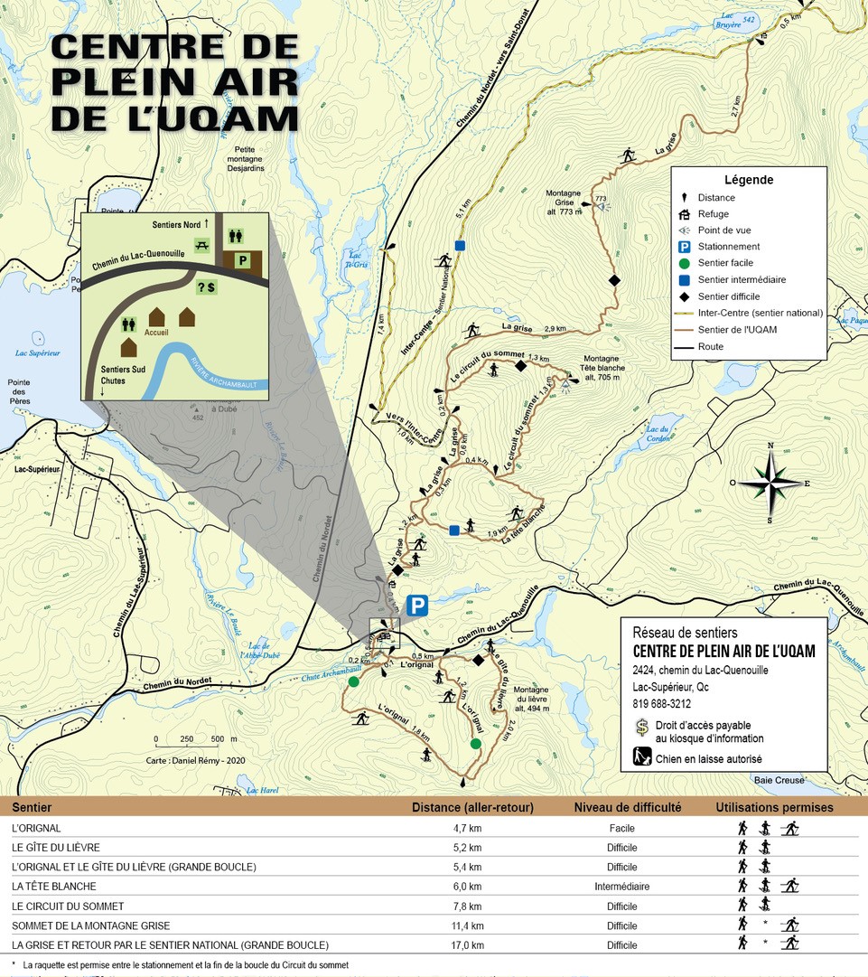 Ce centre a été acquis en 1976 par le centre sportif de l'Université du Québec à Montréal (UQAM), sur l'initiative de quelques professeurs. Il a été développé bénévolement par des étudiants de l'Université et autres membres du centre sportif. Dans la partie nord, on trouve quatre sentiers dont le principal, La Grise, conduit au sommet de la montagne Grise. Il est possible de poursuivre au-delà de la montagne jusqu'au refuge Le Nordet. Dans la partie sud, on pourra admirer la chute Archambault. Deux boucles sillonnent ce secteur, ainsi qu'un sentier d'interprétation de la nature qui permet de découvrir les particularités naturelles de la région.