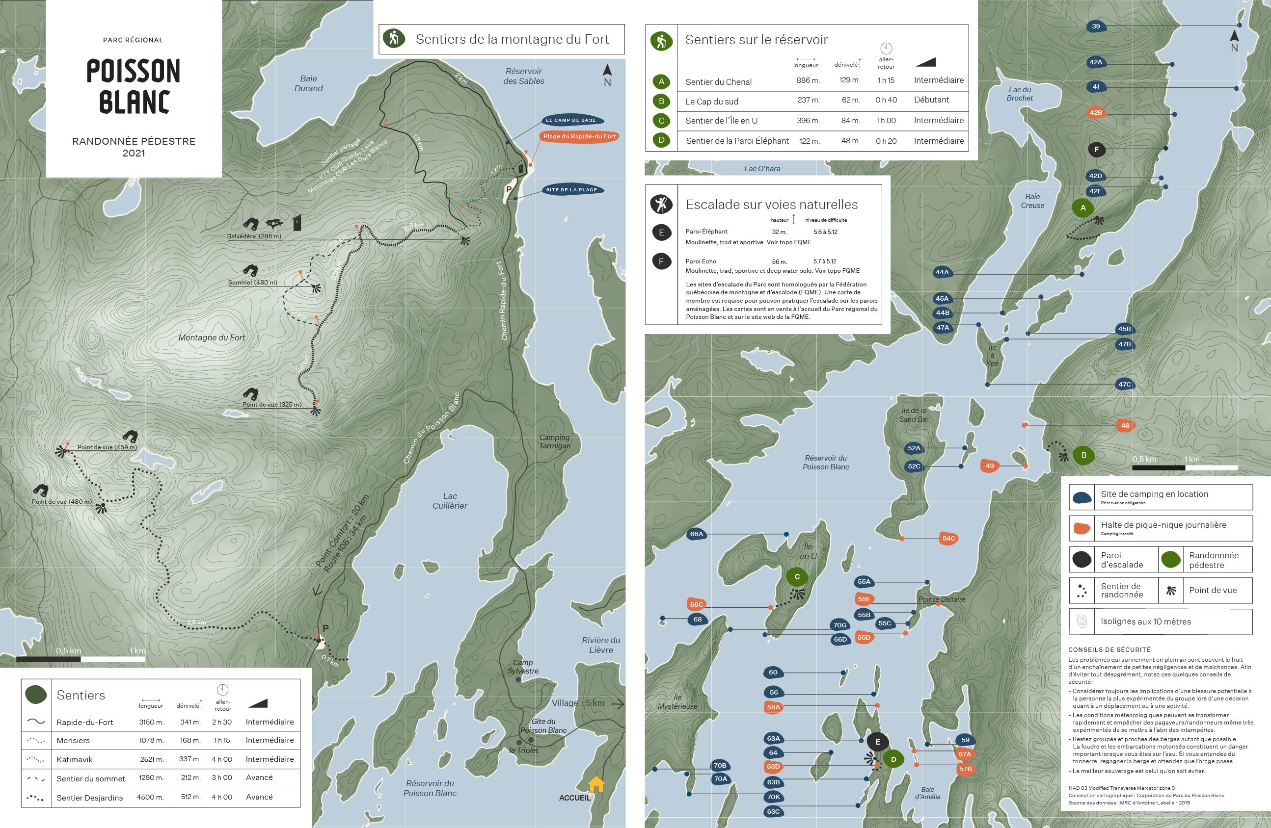 Venez découvrir les 17 kilomètres de sentiers de randonnée pédestre du Parc régional du Poisson Blanc. Les sentiers de randonnées accessibles uniquement par embarcation offrent une vue spectaculaire sur les îles.Les sentiers de randonnée de la montagne du Fort, quant à eux, vous transporteront vers différents points pas piqués des vers tout au long de votre parcours. Notre réseau de sentiers vous permet d'adapter la longueur de votre randonnée en fonction du niveau d'intensité recherché.