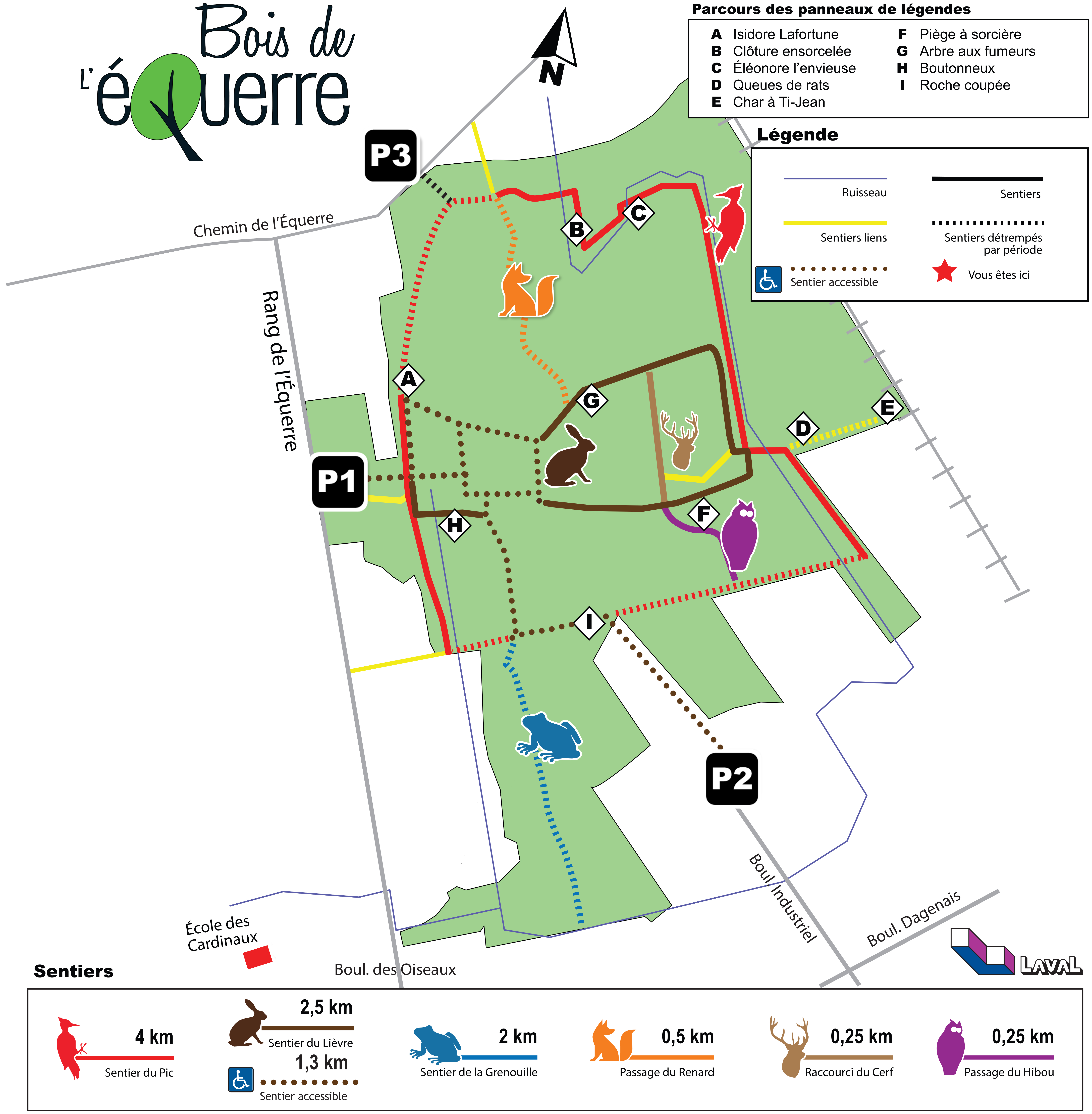 Situé dans le quartier Sainte-Rose, le bois de l'Équerre est l'une des dernières grandes forêts urbaines de Laval. Les sentiers de randonnées (12,95 km) sillonnent 160 hectares accessibles au public traversant de magnifiques milieux naturels : érablière à sucre, friche, marécages arborescents et un écosystème forestier exceptionnel de plus de 90 ans. Pour les personnes à capacité physique restreinte, un sentier de 2,65 km accrédité par Kéroul est accessible au cœur du bois. En hiver, le sentier du Lièvre (2,5 km) est damé pour la marche.