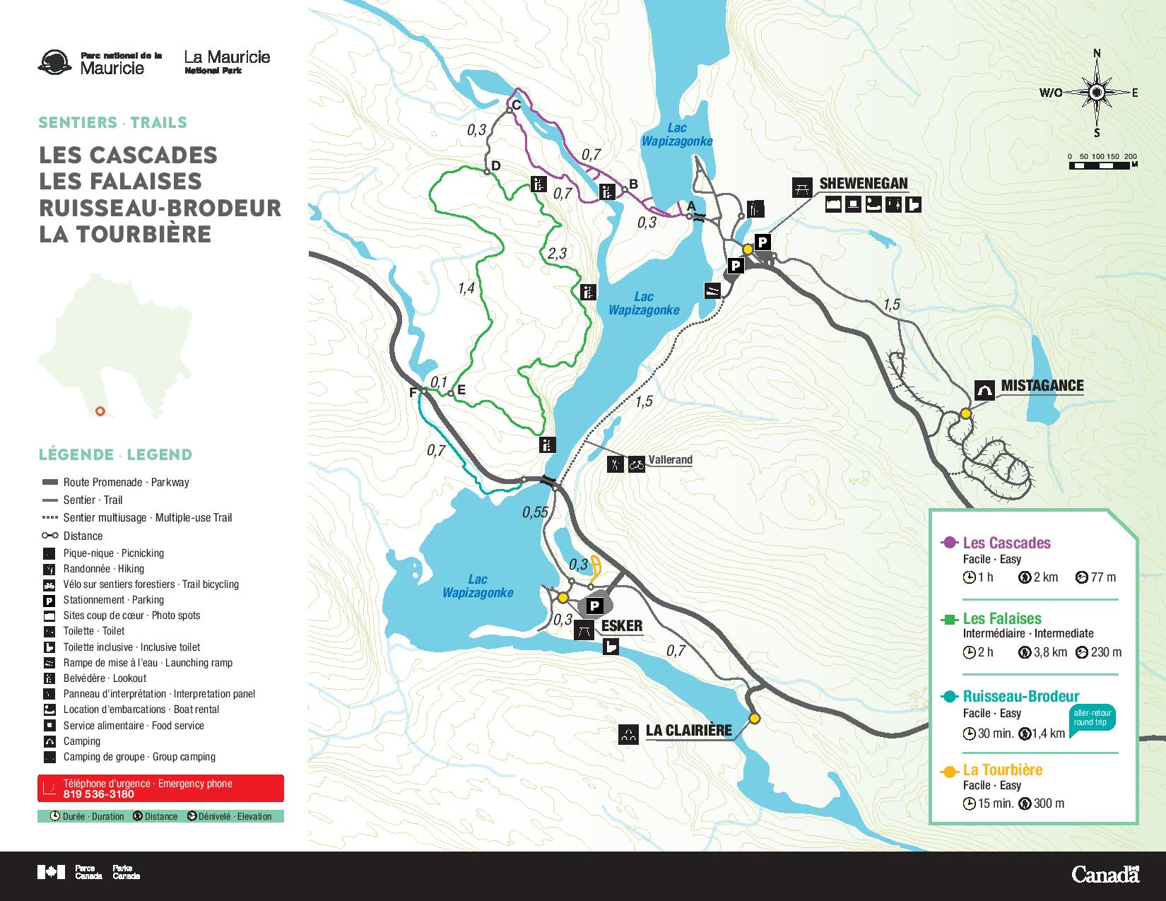 Ce parc, d'une superficie de 536 km², occupe un territoire au relief accidenté sur lequel on trouve des collines, des rivières, des cascades et des lacs. Sur le sentier Mekinac, on traversera une ancienne plantation ayant subi un brûlage dirigé afin de protéger le pin blanc. On traversera deux fois le ruisseau Bouchard avant d'arriver à un belvédère donnant sur le lac Rosoy et la rivière Saint-Maurice. Le sentier du Lac-Gabet sillonne une érablière et conduit à une cache d'observation de la faune située près du lac. Le sentier des Deux-Criques comprend des montées raides menant à différents points de vue sur les environs et conduit aux cascades du ruisseau du Fou. Le sentier des Cascades longe un ruisseau qui coule en cascades à travers un boisé de conifères. De ce sentier, on aura accès à la boucle des Falaises qui se rend au sommet des escarpements rocheux du lac Wapizagonke. Le sentier d'interprétation du Lac-Étienne, bordé d'observatoires et de panneaux, traverse une sapinière et mène à ce lac où un télescope permet d'observer le grand héron, le castor et l'orignal. Les sentiers du Lac-Solitaire, du Ruisseau-Bouchard et du Lac-du-Pimbina forment trois boucles qui s'ajoutent l'une à l'autre, offrant aux randonneurs la possibilité de choisir la longueur et la durée de leur randonnée. Des belvédères sur chacun des sentiers permettent d'avoir des panoramas sur les nombreux lacs du Parc.